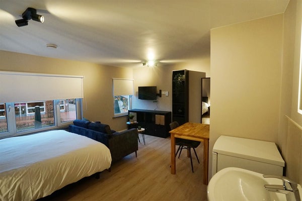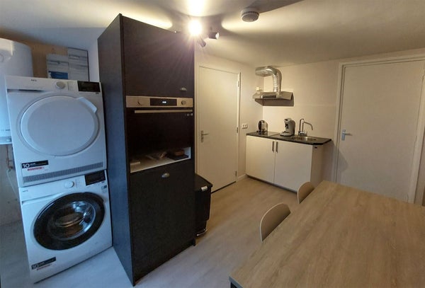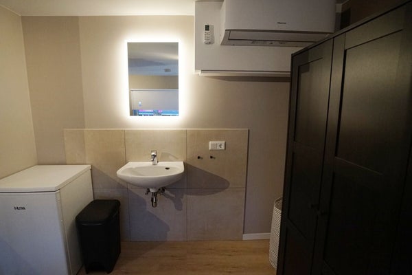 The room offers a sleeping area, living and dining area, refrigerator with freezer, sink, television and airconditioning. In the shared area is the kitchen with dining area, washing machine and dryer. The bathroom with toilet, shower and fountain is also located in shared area.