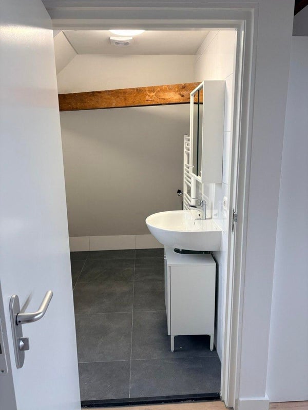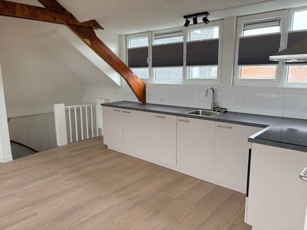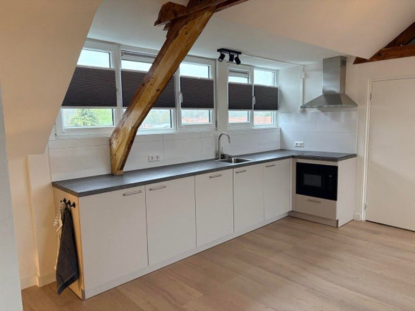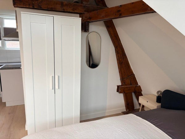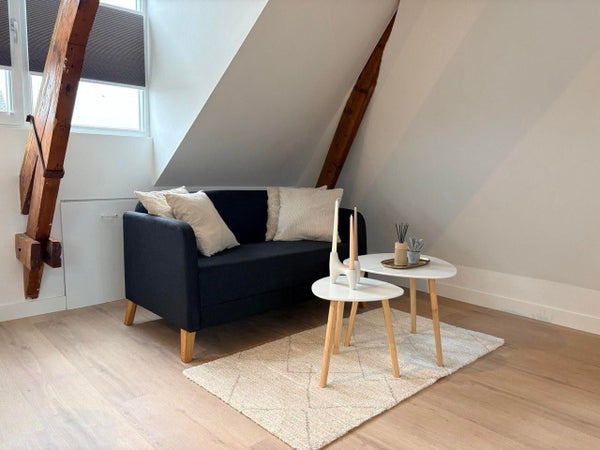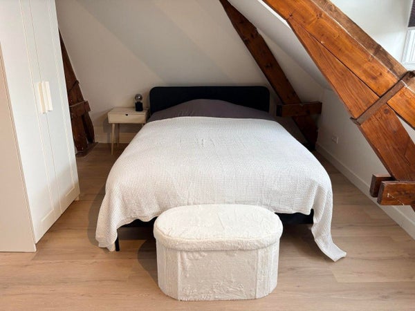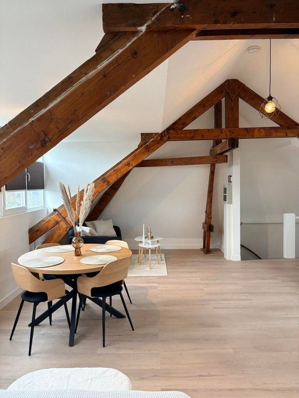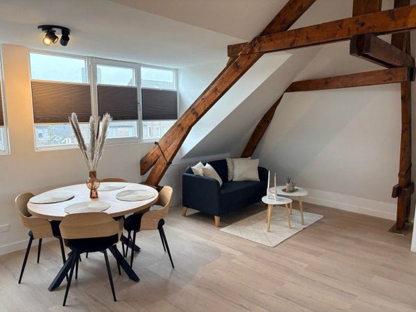 Cette unité spéciale est située au dernier étage et possède un grand espace de type loft de luxe d'environ 45 m², avec deux lucarnes qui apportent de la lumière et de la hauteur. L'espace respire une atmosphère romantique de loft grâce aux poutres en bois visibles, qui ajoutent chaleur et caractère. Grâce à la combinaison de plafonds hauts et de larges fenêtres, la lumière du jour s'écoule tout au long de la journée, créant une ambiance ouverte et accueillante.