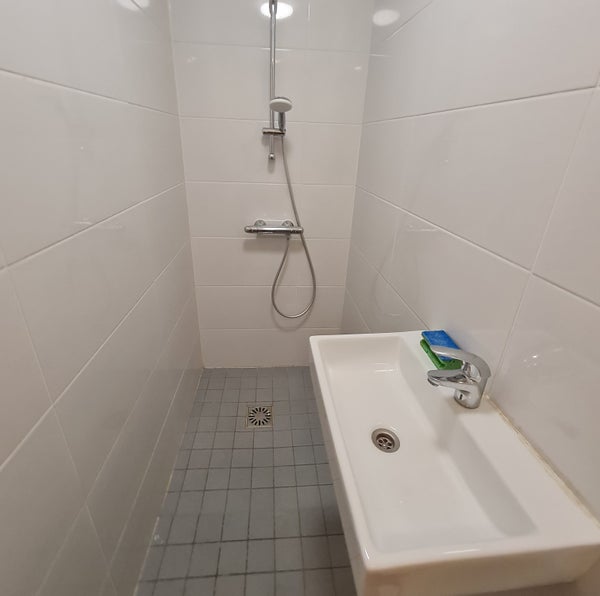 Ce semi-studio dispose d'un joli sol en stratifié et bénéficie de beaucoup de lumière grâce à de grandes fenêtres. Le semi-studio dispose d'une douche, d'un toilet et d'un lavabo privés.