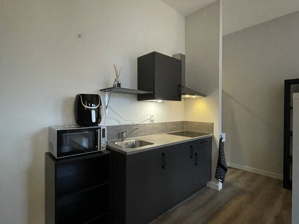 Este estudio de 26 m2 está bien distribuido y cuenta con una cocina abierta con campana extractora, placa de inducción y combinación de frigorífico-congelador. El baño está equipado con una ducha a ras de suelo y un mueble lavabo. Hay un inodoro flotante separado. Hay un área común en la primera planta donde se encuentran las lavadoras y la secadora.