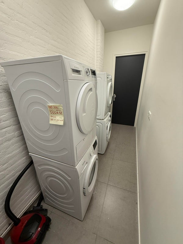 Entrada en un pasillo central, con escaleras hacia el primer piso y acceso a los estudios en la planta baja. Al final del pasillo se encuentra la sala de lavandería con lavadoras y secadoras.