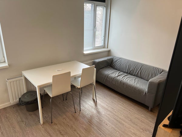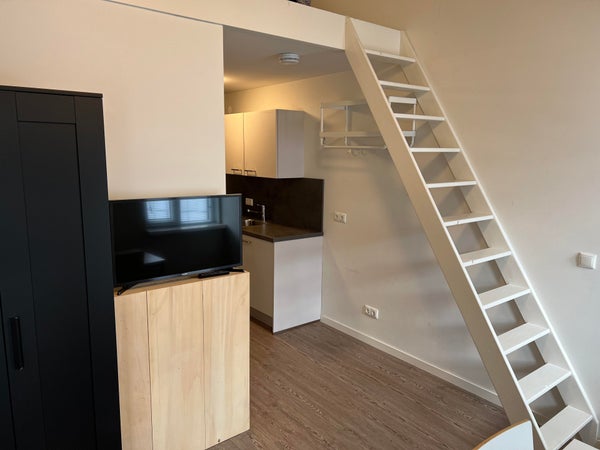 El estudio está ubicado en la planta baja y tiene aproximadamente 25 m2. El estudio cuenta con un alto techo y una gran ventana. Además, hay un hermoso suelo de PVC con efecto madera, y el estudio tiene 2 luces de techo, cortinas, marcos de ventana de plástico con rejilla de ventilación, ventilación controlada por CO2 Duco y un dispositivo de flujo (agua caliente en 10 segundos).