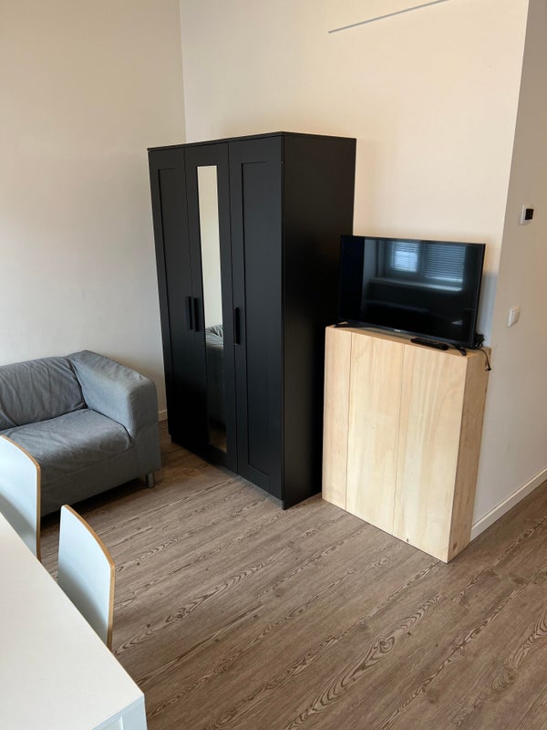 El estudio está completamente amueblado y cuenta con una cama individual, armario, sofá con mesa de centro, mueble para TV con televisor de pantalla plana, lámpara y mesa de comedor con 2 sillas.