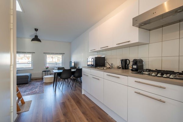 Este luminoso apartamento estudio, ubicado en la última planta de un edificio con terraza en la azotea, se encuentra en el vibrante barrio de 'Cool' - una ubicación absolutamente privilegiada. A través de una entrada compartida, accede a su propia puerta de entrada. La propiedad consta de un área combinada de sala de estar y dormitorio con una cocina abierta en el medio, y un baño privado con inodoro. El estudio se ofrece amueblado. Una escalera lleva a la terraza en la azotea de aproximadamente 30m2, donde podrá disfrutar de la hermosa vista sobre el centro de la ciudad y relajarse en paz.