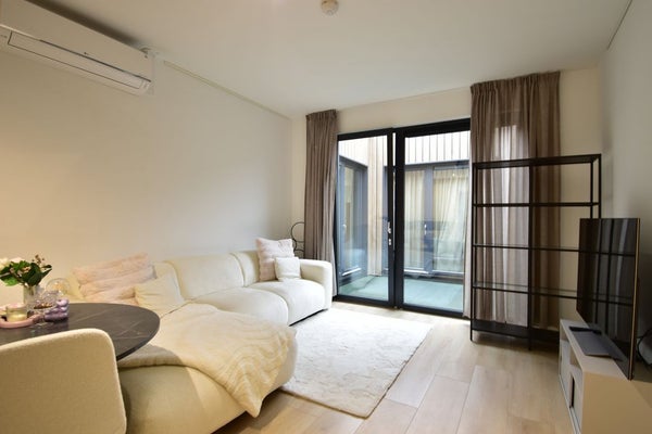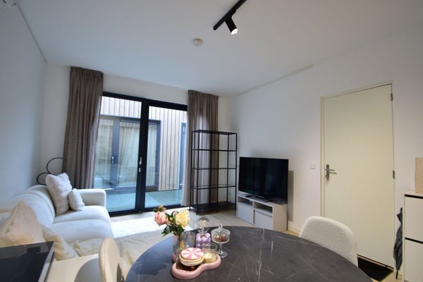 Living room of 23m² with a large window overlooking the patio. The living room has a modern floor, plastered walls, beautiful lamps and a pantry. From the living room access to the separate toilet and the bedroom. The bedroom of approx. 8.5m² has an en-suite bathroom with a walk-in shower, washbasin with furniture and a fresh, sleek look.