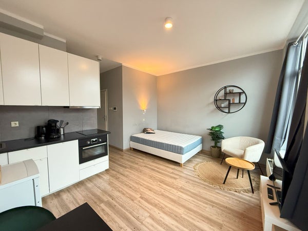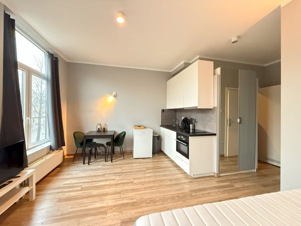 Communal entrance at street level with the private front door to the apartment located on the first floor. This wonderfully bright studio with large windows features a brand-new open kitchen, equipped with an induction hob, luxury mixer tap, extractor hood, fridge/freezer, combi oven, dishwasher, and plenty of cupboard space. The floor is finished with laminate, and the walls are neatly finished.