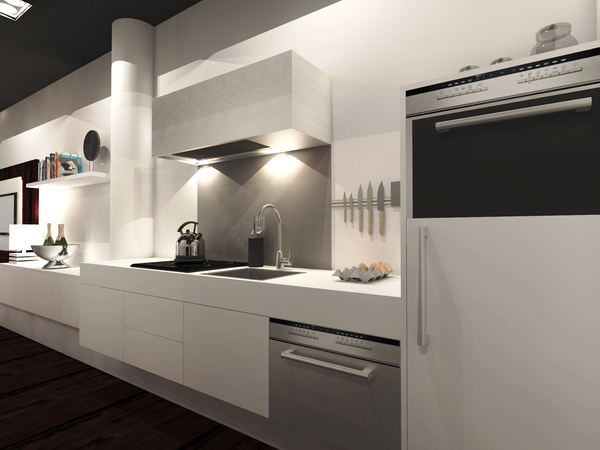 Luxury kitchen with all appliances including dishwasher, combination microwave- oven, refrigerator, sink and hob.