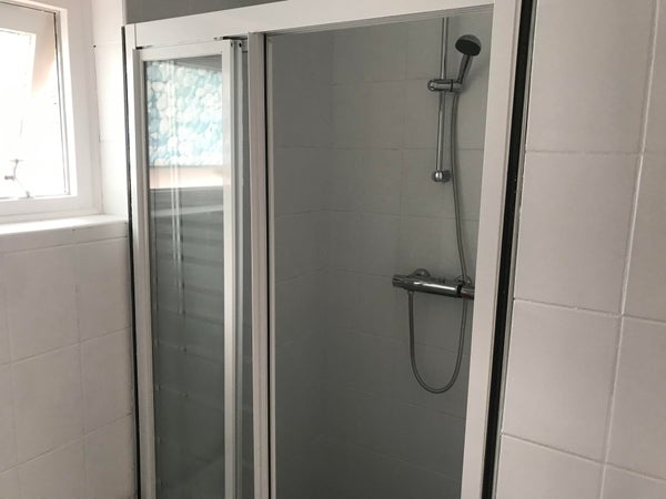 The studio has its own living room with an open kitchen. The kitchen is equipped with built-in appliances (electric stove, extractor hood, fridge-freezer combination). Bathroom with walk-in shower, sink, and mirrored cabinet. Separate bedroom. Shared toilet.