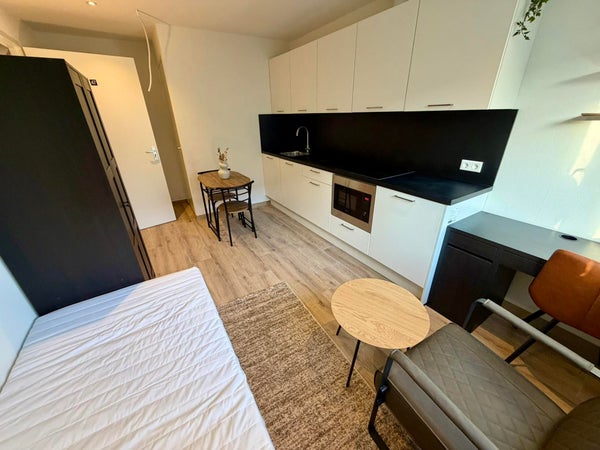 Brand new and furnished studio with own kitchen and shower. All with own high-quality box spring, wardrobe, mattress, etc. The bathroom and toilet have been completely renovated and the bathroom is equipped with a luxury rain shower. It is not possible to rent the studio without furniture.