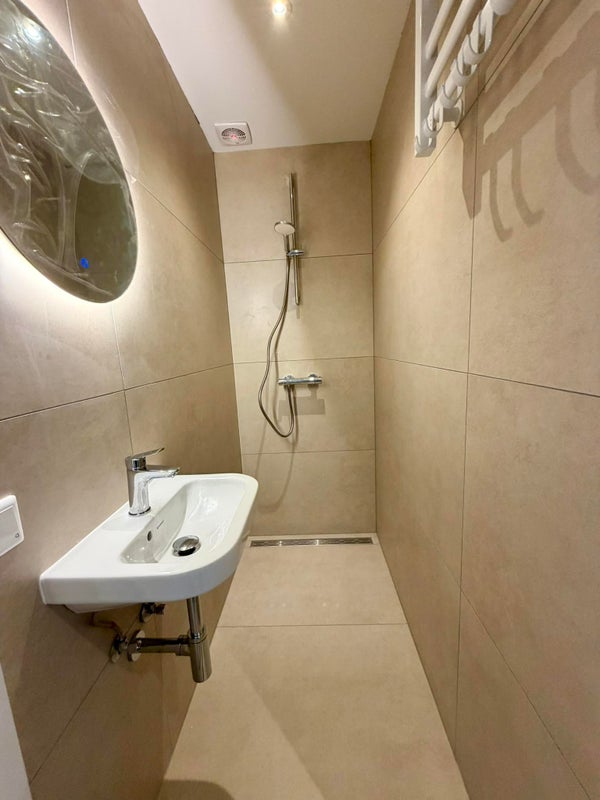The new kitchen is equipped with built-in appliances (electric hob, extractor hood, fridge-freezer combo). Bathroom with walk-in shower, sink, and mirror. Space for washing machine/dryer and toilet in the hall (shared).