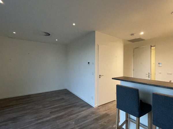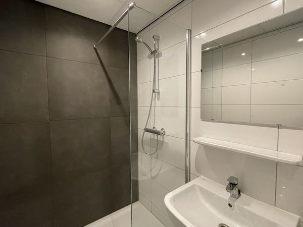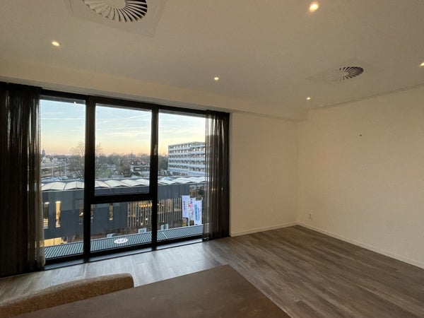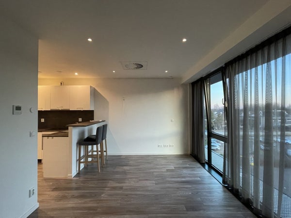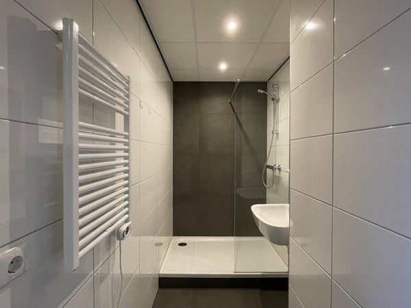 The studio is fully furnished. There is already a PVC floor, the walls are covered with wallpaper, there are two curtain rails installed, one of which is already fitted with in-between curtains, and you don't need to hang any lamps because there is already LED lighting installed in the ceilings. They even thought of picture rails so you don’t have to drill any holes yourself!