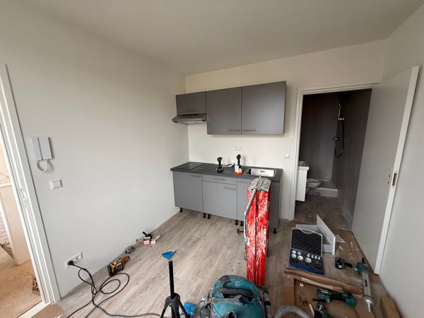 Lo studio è stato completamente ristrutturato nel 2026 ed è dotato di una cucina con elettrodomestici a incasso. Il bagno è moderno e funzionale, arredato con un radiatore per asciugamani, una doccia walk-in, un WC a parete e un lavabo.