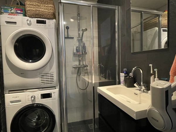 Das Badezimmer ist komplett und modern gefliest und verfügt über eine Regenbrause und Handbrause hinter einer luxuriösen Duschwand. Es gibt eine hängende Toilette, einen schwarzen Hochglanz-Waschtisch mit Mischbatterie und einen Handtuchradiator. Außerdem gibt es hier Fußbodenheizung und Anschlüsse für eine Waschmaschine und einen Trockner.