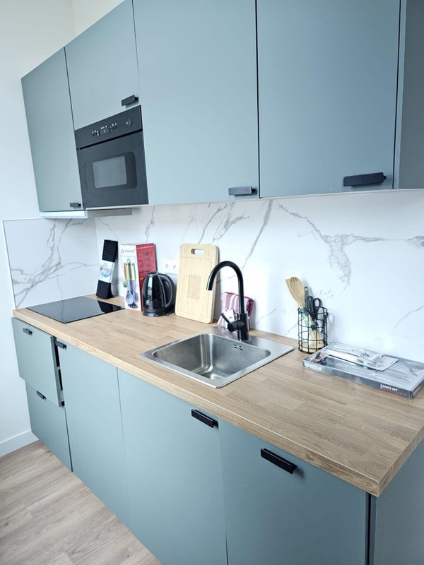 Das Studio verfügt über eine hochwertige Küche mit Kühlschrank/Gefrierkombination, Mikrowelle, Induktionsherd und Geschirrspüler