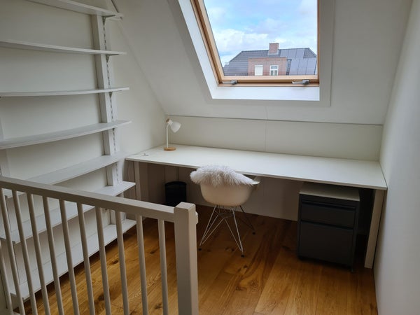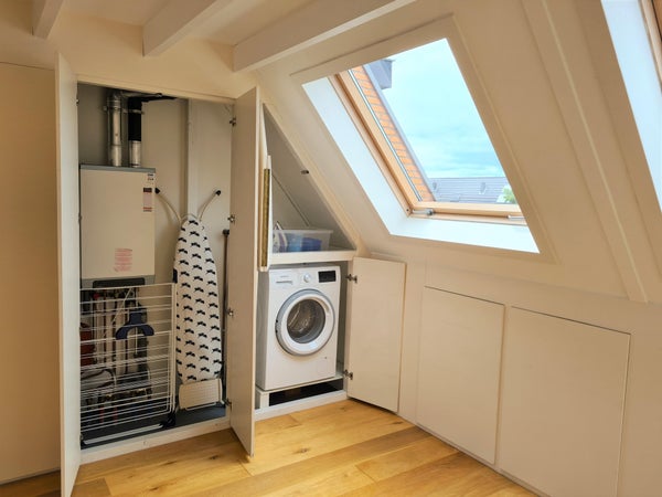 Zweiter Stock: Im zweiten Stock befindet sich ein sehr geräumiges Zimmer mit viel Stauraum und einer Waschmaschine. Es gibt auch einen separaten Sitzbereich mit Schreibtisch.