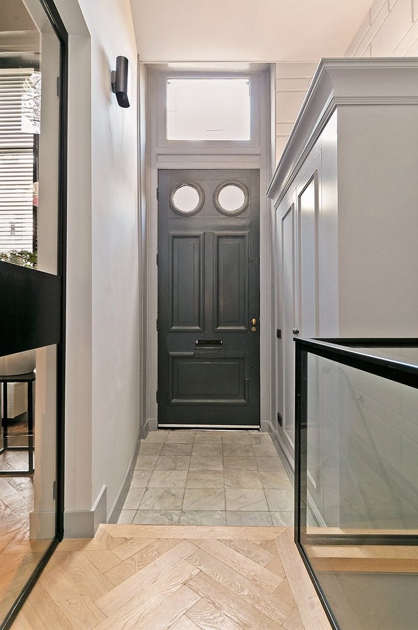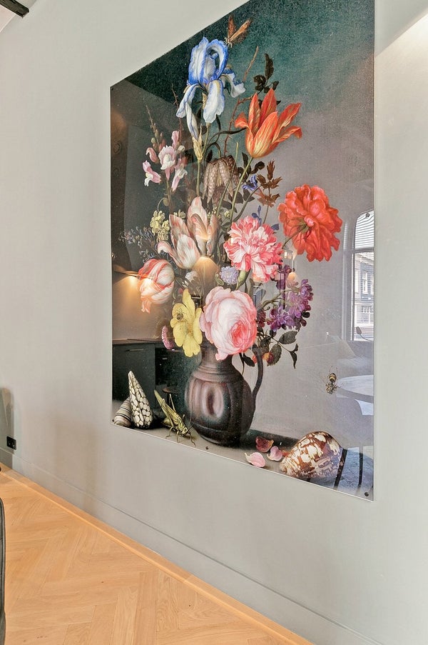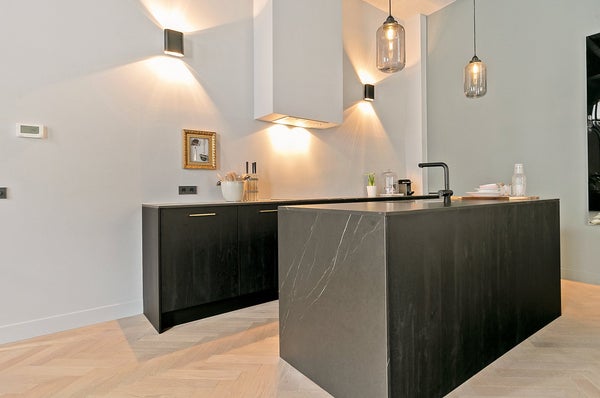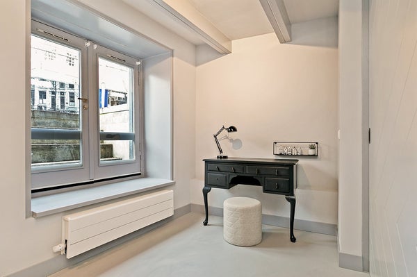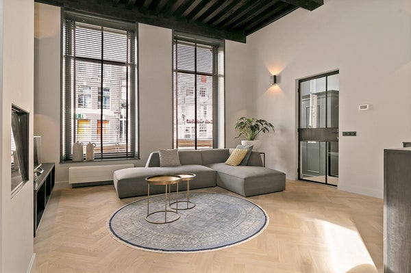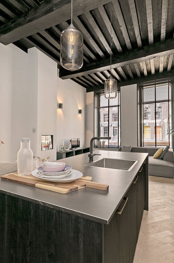 Über einen eigenen Eingang betreten Sie ein Wohn- und Esszimmer, das sofort Eindruck macht. Vier Meter hohe Holzbalkendecken, zwei große Fenster mit Blick auf den Kanal und ein drittes mit Aussicht auf die ruhigere Koestraat lassen Licht in Hülle und Fülle strömen. Die offene Küche verfügt über eine luxuriöse Insel mit allen notwendigen Geräten. Ein elektrischer Kamin rundet das Wohnzimmer ab — warm, raffiniert und überraschend ruhig für eine so zentrale Lage.
