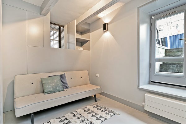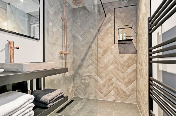 Eine elegante Glas- und Stahltür führt in den Flur, der über einen großen Kleiderschrank, ein separates WC und einen separaten Waschraum verfügt. Über die Treppe in das Untergeschoss gelangen Sie in einen überraschend hellen Raum mit großzügigen Fenstern. Zwei Schlafzimmer — ein Hauptschlafzimmer mit Doppelbett und begehbarem Kleiderschrank sowie ein zweites Zimmer, das ideal als Gästezimmer oder Home Office genutzt werden kann — teilen sich ein wunderschön gestaltetes Badezimmer. Schiebetüren und eine vollständige Isolierung garantieren Privatsphäre und einen ruhigen Schlaf.