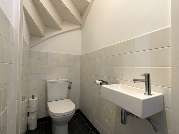 Treppe zur ersten Etage, die ein Schlafzimmer und ein ordentliches Badezimmer umfasst. Das Badezimmer verfügt über ein zweites WC, ein Waschbecken und eine begehbare Dusche.