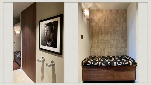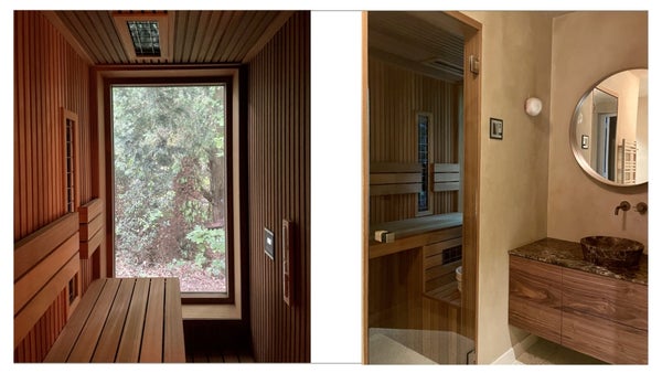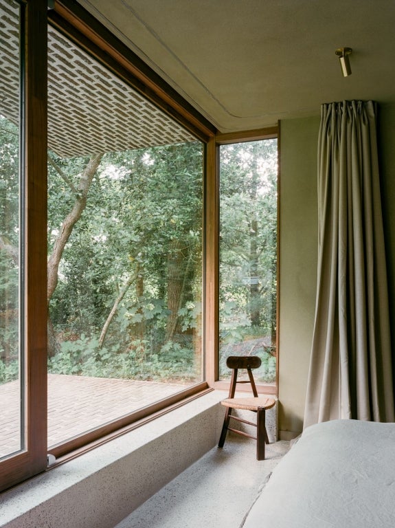 Das Schlafzimmer im Erdgeschoss fühlt sich wie ein luxuriöses Hotelzimmer an, mit großen Einbauschränken und einem eigenen Badezimmer mit Dusche, Waschbecken und privater Sauna. Vom Duschen aus haben Sie einen schönen Blick auf den Grünen Garten — pure Wellness zu Hause.