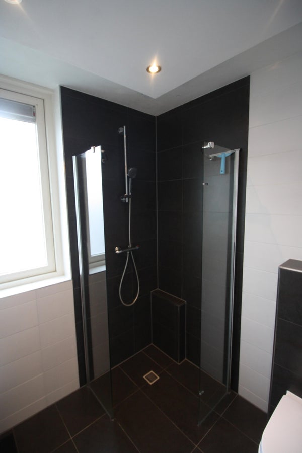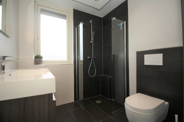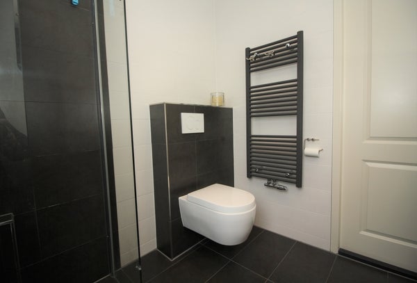 Das Badezimmer hat einen modernen Look und verfügt über eine begehbare Dusche mit thermostatischem Duscharmatur, Waschtisch mit Waschbecken und Mischbatterie, Toilette und Designerheizkörper.