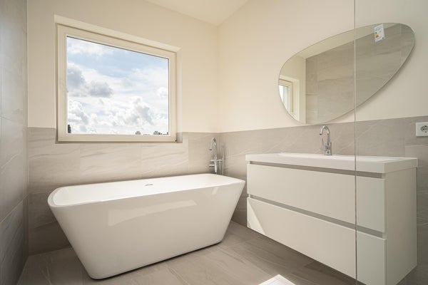 Von der Diele führt die Treppe zur 2. Etage, Flur mit zwei Einbauschränken und getrenntem WC, zweites vollwertiges Badezimmer mit begehbarer Dusche mit Glaswand, freistehende Badewanne und Badezimmermöbel mit Waschbecken. Schließlich das großzügige zweite Wohnzimmer mit Pantry, spektakulärem Lichteinfall und Sonnenterrasse mit Blick auf der rechten Seite über die Dünen des Zwarte Pad. Diese Räumlichkeit kann gegebenenfalls von einem Käufer in zwei große Schlafzimmer aufgeteilt werden.