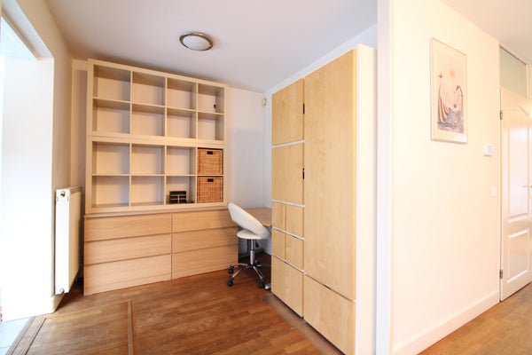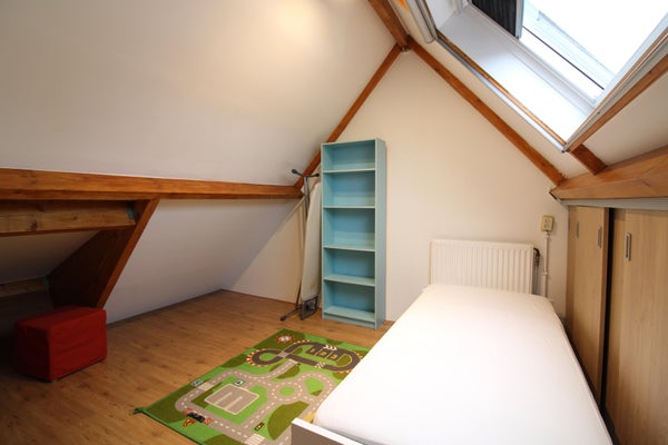 Das dritte Schlafzimmer ist geräumig und hat eingebaute Regale und Stauraum unter dem schrägen Dach. Das Velux-Fenster hat Rollläden.