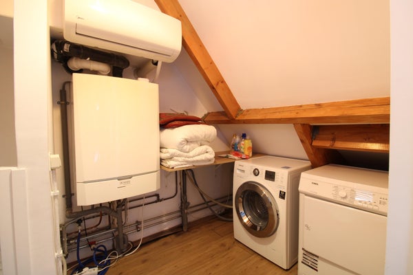 Geräumiger Flur mit Heizkessel, Abstellraum, Samsung Waschmaschine und AEG Trockner.