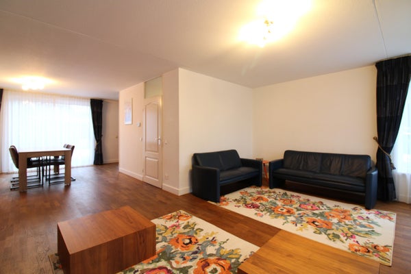 Geräumiges U-förmiges Wohnzimmer von 50 m² mit unter anderem einer großen TV-/Sitzecke (20 m²), Essbereich mit 4 Sessel aus Holz und Arbeitszimmer mit Schreibtisch, Schrank und ausreichend Schubladen und Regalen. Schiebetüren zum Garten und große Fenster an beiden Seiten machen den Raum hell und luftig. Die Ausführung besteht aus einem Holzboden und Stuckwänden und -decken.