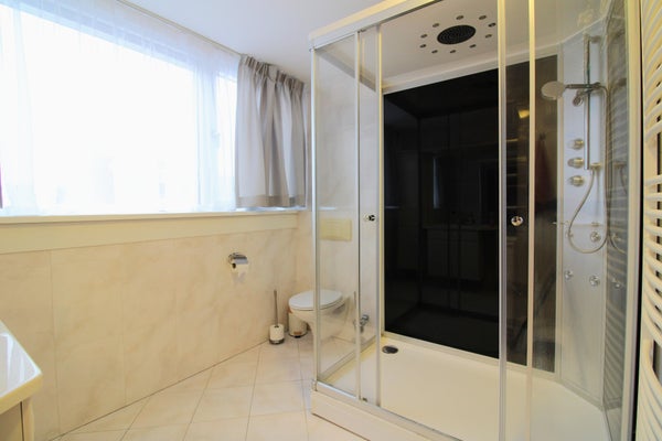 Großes, komplett gefliestes Badezimmer mit einer neuen, extra großen Dusche, einschließlich Regen- und Handbrause sowie Massagestrahlen.