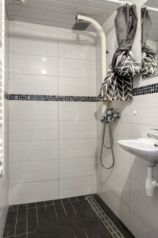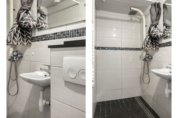 In der ersten Etage befinden sich drei vollwertige Schlafzimmer. Die zwei größten Zimmer bieten problemlos Platz für ein Doppelbett und einen Kleiderschrank. Das dritte Schlafzimmer ist etwas kompakter, aber hier kann problemlos ein Einzelbett mit Schrank untergebracht werden – ideal als Kinder-, Gäste- oder Arbeitszimmer. Außerdem finden Sie hier das zweite, ebenfalls Hauptbadezimmer. Dieses ist mit einer Sitzbadewanne, separater Dusche, Toilette und einem Waschbecken mit Möbel ausgestattet. Ein komplettes und komfortables Badezimmer für die ganze Familie.