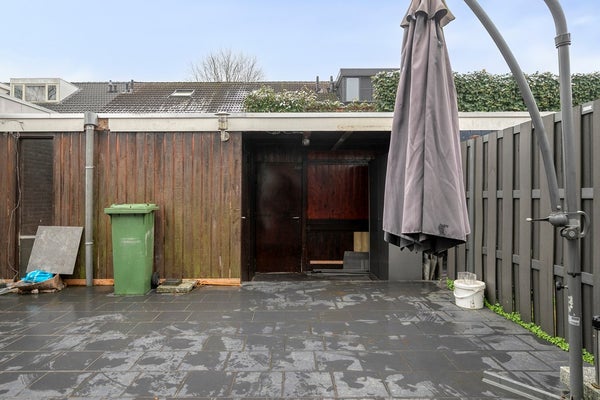 Das Haus verfügt natürlich über einen schönen Hintergarten mit viel Platz für eine Lounge-Ecke. Hier können Sie sich entspannen und das Leben im Freien genießen. Im hinteren Teil des Gartens befindet sich ein Abstellraum mit Überdachung, was zusätzlichen Stauraum und die Möglichkeit schafft, geschützt im Freien zu sitzen.