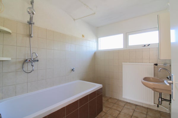 Das Badezimmer verfügt über eine Badewanne mit Dusche, ein Waschbecken mit Spiegel sowie einen Anschluss für die Waschmaschine. -