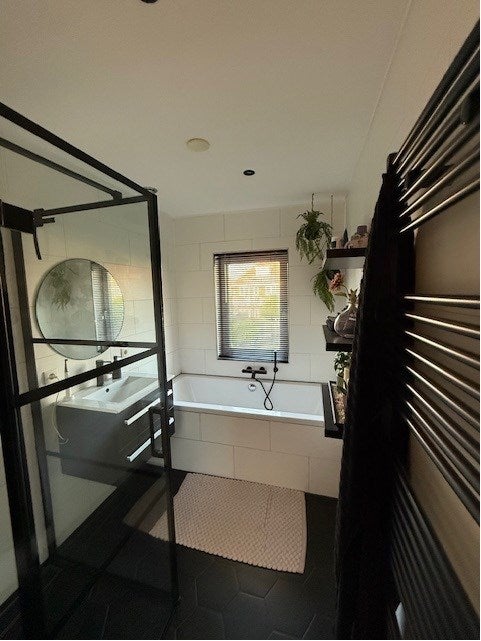 • Moderne und geräumige Badezimmer mit Badewanne, Waschbecken, Heizkörper und begehbarer Dusche