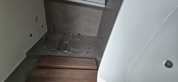 -Raum für Wohnzimmer, moderne Küche, Hauswirtschaftsraum und Badezimmer mit Badewanne und Dusche