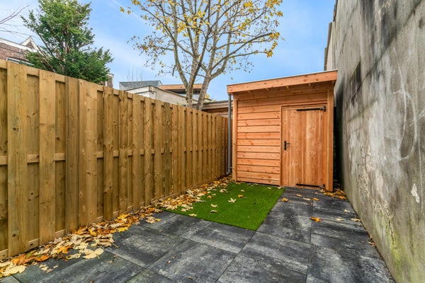 Der Garten bildet eine angenehme Erweiterung des Wohnraums und ist über die französischen Türen von der Küche aus zugänglich. Dieser pflegeleichte Außenbereich ist ordentlich angelegt und bietet einen angenehmen Platz, um sich zu entspannen. Am Ende des Gartens steht ein ordentlicher Holzschuppen, ideal für zusätzlichen Stauraum. Ein praktischer und geschützter Außenbereich, der perfekt zum Stadtleben passt.