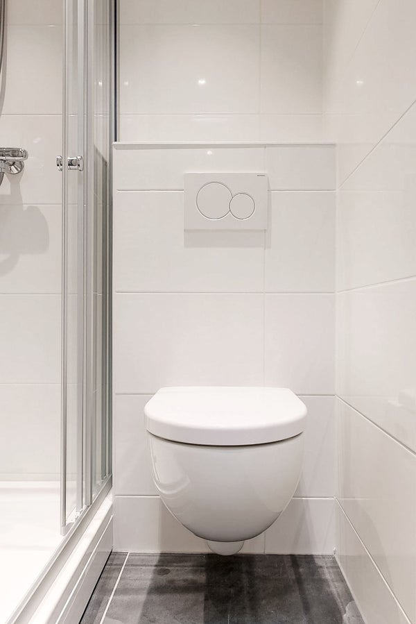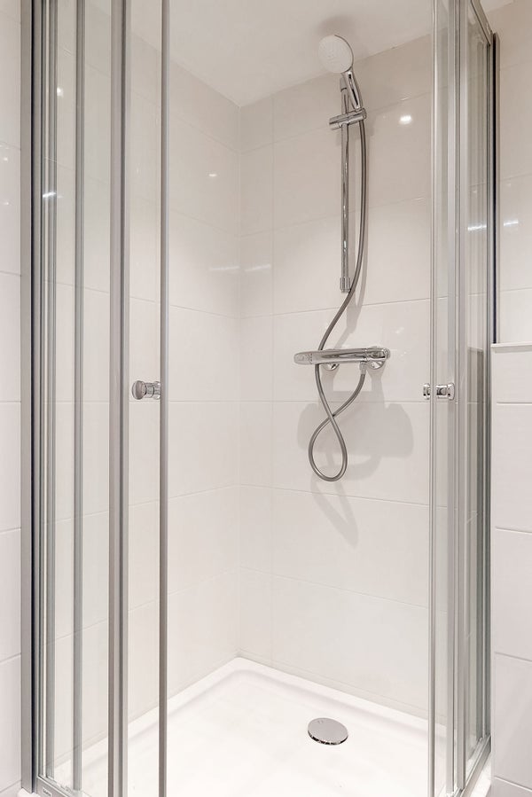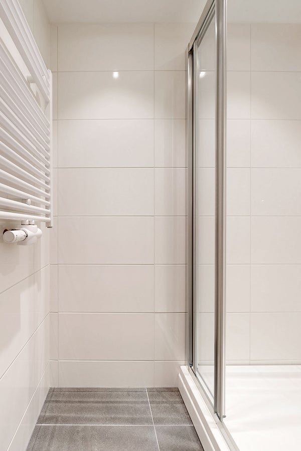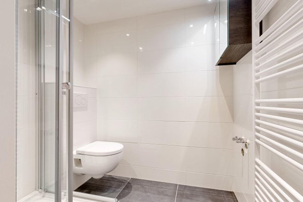 Der Flur im ersten Stock bietet Zugang zu zwei Schlafzimmern und dem ersten Badezimmer. Beide Schlafzimmer sind gut proportioniert, ordentlich gestaltet und genießen viel Tageslicht. Das Zimmer an der Vorderseite bietet Blick auf die Straße, während das Schlafzimmer auf der Rückseite ruhiger liegt. Das moderne Badezimmer befindet sich zentral auf dieser Etage. Es verfügt über ein elegantes Design und umfasst eine begehbare Dusche, eine zweite Toilette und ein Waschbecken. Die Wandverkleidung und das praktische Design sorgen für ein frisches und gepflegtes Aussehen.