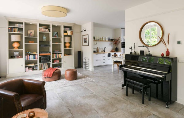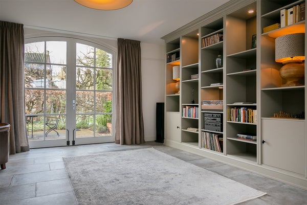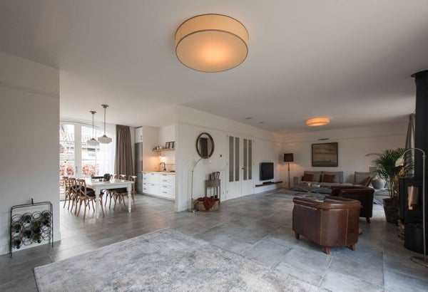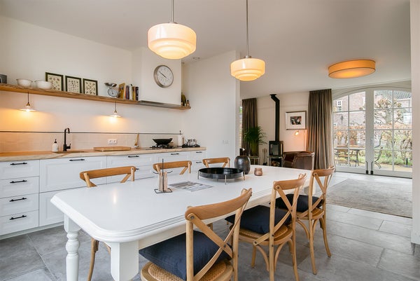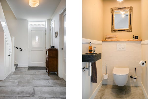 RAUMAUFTEILUNG Das Haus befindet sich in einer ruhigen, Sackgasse des Nieuw-Loosdrechtsedijk, mit dem Kasteel-Museum Sypesteyn als besonderen Nachbarn. Am Ende der Straße stehen zwei eigene Parkplätze zur Verfügung. Über den gepflasterten Vorgarten erreichen Sie die Eingangstür. Vom geräumigen Flur aus können Sie die getrennte Toilette, den Treppenraum, das Wohnzimmer und die Treppe zum ersten Stock erreichen. Auf der linken Seite des breiten, luxuriösen Wohnzimmers befindet sich die gemütliche Sitzecke mit unter anderem einer großen Eckcouch und einem Fernseher mit Sonos-Soundbar. In der Mitte des Wohnzimmers stehen zwei Sessel rund um den Holzofen und gegenüber dem Klavier. Auf der rechten Seite des Wohnzimmers steht ein wandfüllendes (Bücher)Regal und der Zugang zur halb-offenen, verspielten Wohnküche an der Vorderseite des Hauses. Dieser originale Raum hat auf zwei Seiten eine Küche und in der Mitte einen Esstisch. Auf der linken Seite stehen unter anderem eine Spülmaschine, Kühlschrank, Kombi-Ofen, Kaffeemaschine, Spüle und viel Stauraum. Rechts steht ein noch größerer Kühlschrank mit Gefrierfach, es gibt drei Kochfelder (Gas und Induktion), und auch hier gibt es ausreichend Stauraum und erneut eine Spüle. An der Wand hängt ein kleiner Fernseher. Die französischen Türen in der Küche bieten Zugang zum Vorgarten.