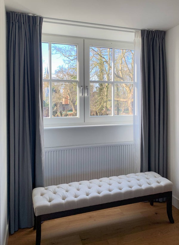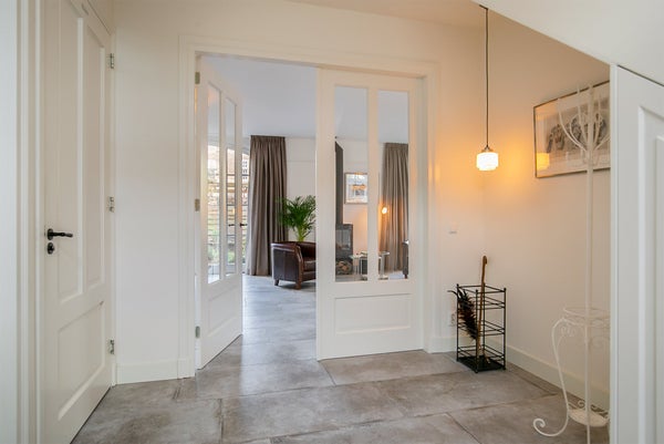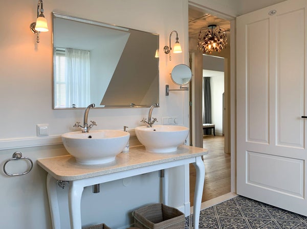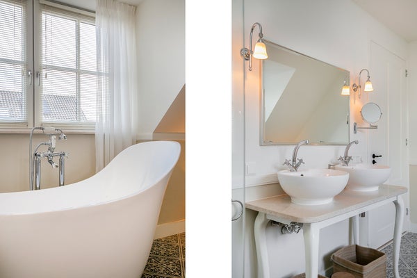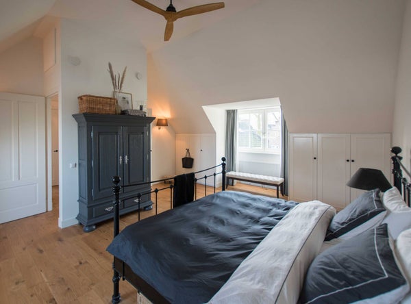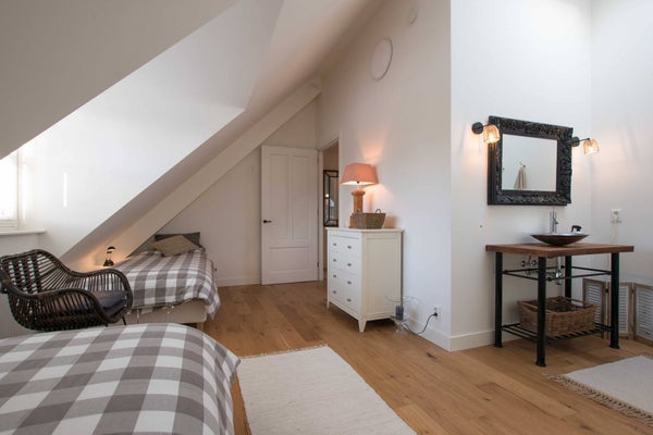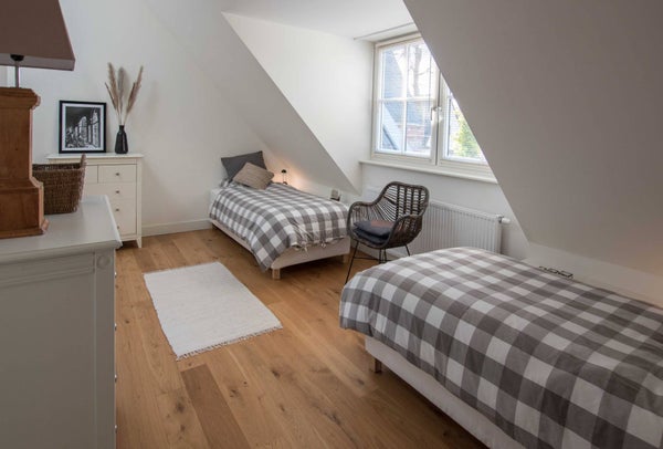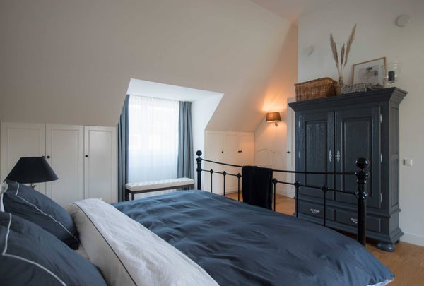 Im ersten Stock erreichen Sie über die Diele die beiden Schlafzimmer, das Badezimmer und den Waschraum. Der Waschraum ist hinter zwei Türen verborgen und mit einer Waschmaschine und einem Trockner ausgestattet. Das stilvolle Badezimmer verfügt über eine freistehende Badewanne, Dusche, Doppelwaschbecken und WC. Das große Hauptschlafzimmer nimmt die gesamte Tiefe des Hauses ein, mit Fenstern sowohl an der Vorder- als auch an der Rückseite. Das Schlafzimmer ist mit einem 200x200 cm großen Doppelbett, einem Wäscheschrank und auf beiden Seiten Einbauschränken mit ausreichend Platz für Kleidung ausgestattet. Da das Zimmer ursprünglich als zwei Schlafzimmer konzipiert wurde, gibt es zwei Zugangstüren von der Diele. Das L-förmige zweite Schlafzimmer ist mit zwei Einzelbetten, einem Waschbecken und einem Lichtkuppel ausgestattet und bietet einen schönen, ungehinderten Blick auf den Schlossgarten.