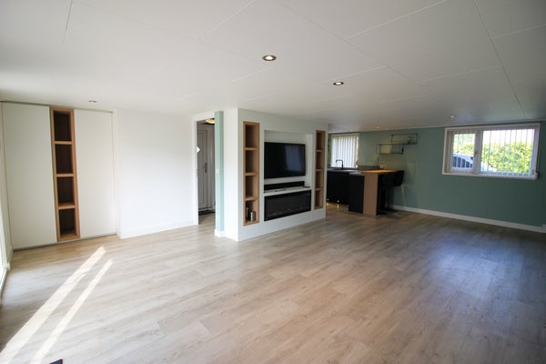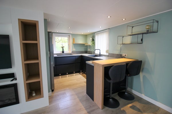Beim Betreten gelangen Sie in ein gemütliches und stimmungsvolles Wohn-/Esszimmer mit moderner offener Küche, die mit allen Annehmlichkeiten ausgestattet ist, darunter Kühlschrank, Geschirrspüler, Induktionskochfeld mit Absauganlage und Kombi-Ofen. Das Haus hat viel Tageslicht und lässt sich über die weit aufschwingenden Türen zur Terrasse und dem schön gestalteten Garten rund um das Haus betreten. Das Haus wird durch elektrische Heizkörper und/oder einen Holzofen beheizt, was die intime, heimelige Atmosphäre perfekt macht. Außerdem verfügt das Haus über ein luxuriös, ordentlich gestaltetes Badezimmer mit begehbarer Dusche, Toilette und Waschbecken sowie einer Waschmaschine und einem Trockner. Darüber hinaus hat das Haus 1 Schlafzimmer und einen Raum für ein Gästezimmer oder zusätzlichen Stauraum für Schränke oder ein Homeoffice.