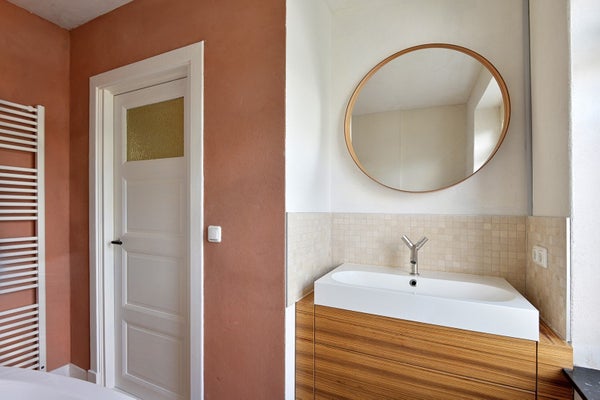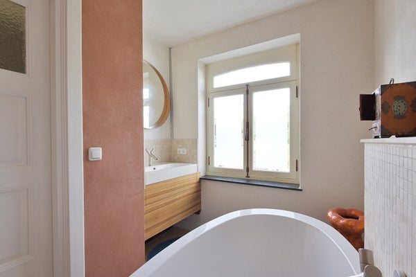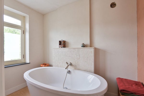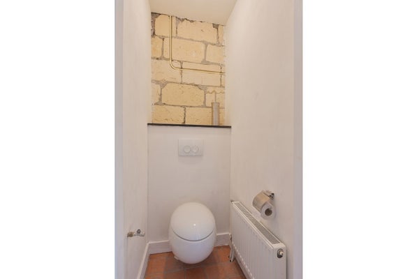 Geräumiger Flur, (Haupt-)Schlafzimmer an der Vorderseite, das stimmungsvolle Bad ist mit einer großzügigen ovalen Badewanne ausgestattet und in der Nische steht ein modernes Waschbecken mit einem Designerarmatur und einem runden Spiegel. Das Badezimmer befindet sich an der Rückseite mit Blick auf die Felder von St. Pieter. Es gibt ein separates WC mit schönem hängendem WC an einem Teil der Mergelmauer. Über die feste Treppe ist die zweite Etage erreichbar.