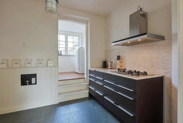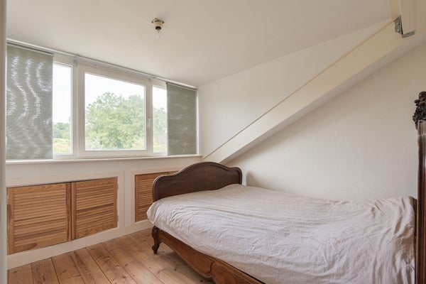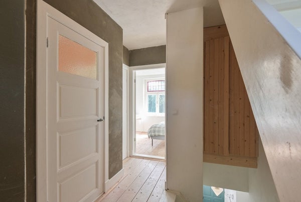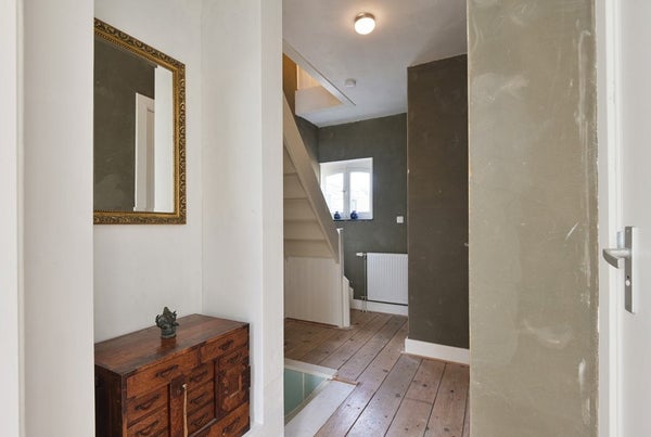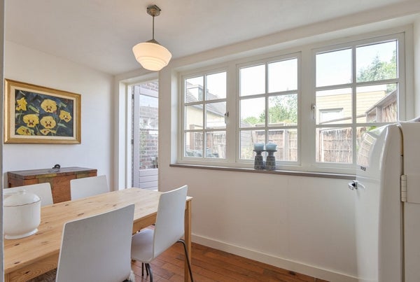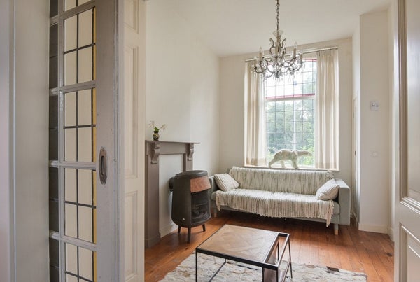 Das gemütliche Wohnzimmer hat vorne originale Fenster mit Buntglas, von denen aus man einen guten Blick auf die schönen Bäume an der Lage Kanaaldijk hat. Es gibt einen Kamin, originale Holzdielen, Wände mit Lehmunterputz, Stuckdecke und die en-suite Türen mit Buntglas bilden eine stilvolle Einheit.