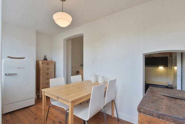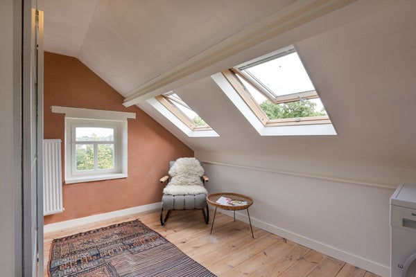 Flur und zwei geräumige Schlafzimmer. Das Zimmer an der Vorderseite hat zwei große Dachfenster und ein Fenster in der Seitenwand. Dank des breiten Dachfensters an der Rückseite wurde der Raum im zweiten Stock erheblich vergrößert. Ein Zimmer wird als Ankleide- und Waschraum genutzt, und unter dem Dachfenster befinden sich Fensterläden zu dem Stauraum im Gefälle des Daches.