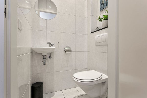 - Vollständig gefliestes WC mit Wand-WC und Handwaschbecken.