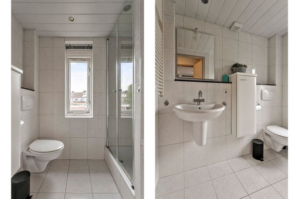 - Vollständig gefliestes Badezimmer mit Duschkabine, Wand-WC und Waschbecken. Das Bad ist außerdem mit einem Design-Heizkörper, mechanischer Belüftung, Tageslicht durch ein Fenster und Einbauspots ausgestattet.