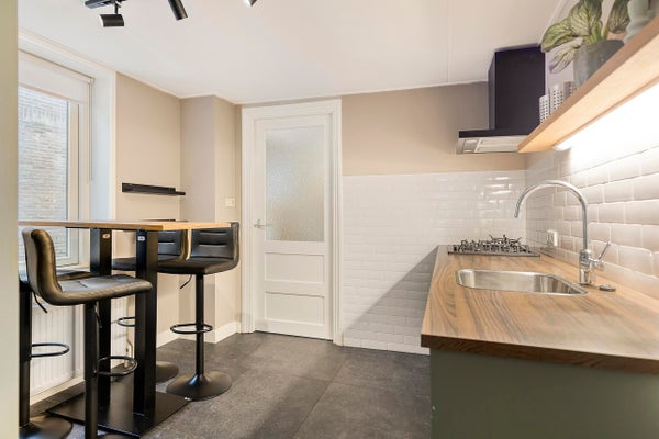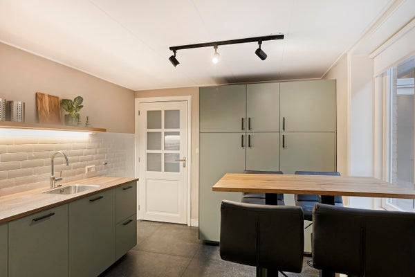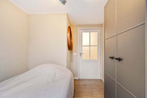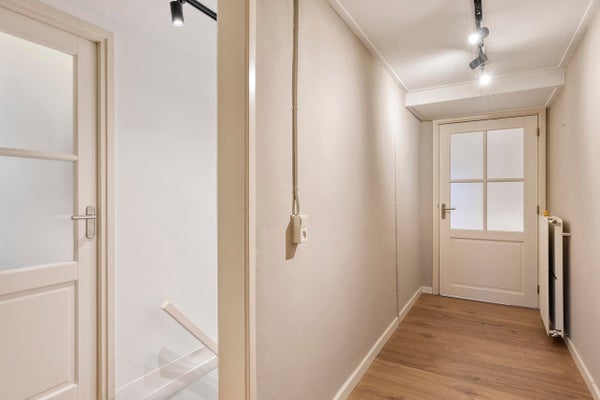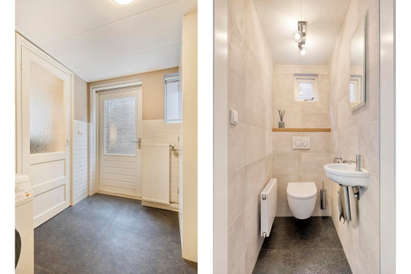 In der Waschküche befinden sich die Anschlüsse für Waschmaschine und Trockner sowie der Heizkessel (Nefit HR Kombi). Von hier gelangst du zur Toilette, die mit einer hängenden Toilette, einem Waschbecken und einem Fenster zur Belüftung ausgestattet ist. Die Waschküche ist mit einem Fliesenboden ausgestattet und bietet Zugang zu einem vollständig gefliesten Abstellraum mit Fenster.