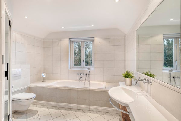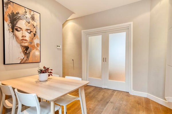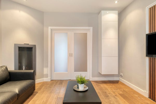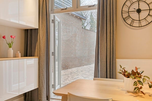 Das Wohnzimmer ist stimmungsvoll und hell, nicht zuletzt dank des großen Fensters an der Vorderseite. Der Raum ist mit einem Holzfußboden ausgestattet und verfügt über Einbauspots und einen Gaskamin von Faber. Durch en-suite Türen gelangst du zum Essbereich, der ebenfalls mit Einbauspots und französischen Türen zum Garten ausgestattet ist. Ein angenehmer Wohnraum mit einem schönen Grundriss.