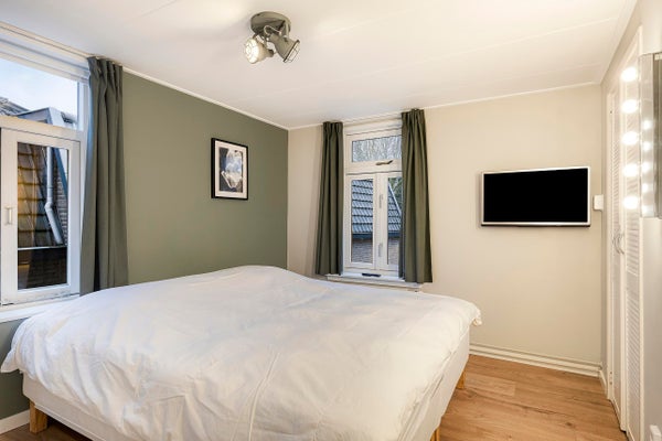 Schlafzimmer mit einem Doppel-Fenster und angenehmem Licht.