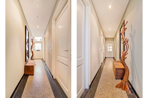Durch die Eingangstür gelangst du in einen langen Flur mit einem charakteristischen Terrazzo-Boden und Einbauspots. Vom Flur aus hast du Zugang zum Wohnzimmer, Esszimmer, zur Küche, zur Kellerablage und zur Treppe ins erste Obergeschoss.