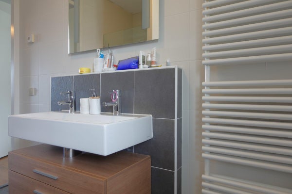 Über die Treppe gelangen Sie zur Etage, die Zugang zu zwei Schlafzimmern auf der Rückseite des Hauses, einem Abstellraum mit Waschmaschinen- und Trockneranschlüssen und dem Hauptschlafzimmer, das sich auf der Vorderseite des Hauses befindet, bietet. Neben dem Hauptschlafzimmer befindet sich das Badezimmer, das mit einer Dusche, einer Toilette, einem Doppelwaschbecken mit Möbeln und einem Design-Heizkörper ausgestattet ist.