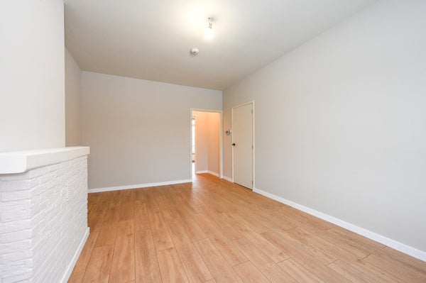 Das helle Wohnzimmer befindet sich an der Vorderseite der Wohnung und verfügt über einen Erker mit freiem Blick auf einen grünen Platz.